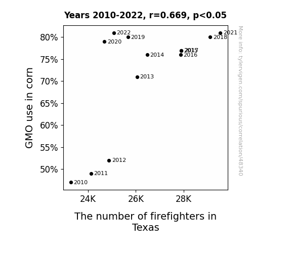This means 44.7% of the change in the one variable (i.e., The number of firefighters in Texas) is predictable based on the change in the other (i.e., GMO use in corn) over the 13 years from 2010 through 2022.
