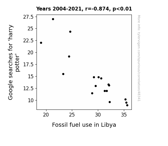 This means 76.4% of the change in the one variable (i.e., Fossil fuel use in Libya) is predictable based on the change in the other (i.e., Google searches for 'harry potter') over the 18 years from 2004 through 2021.