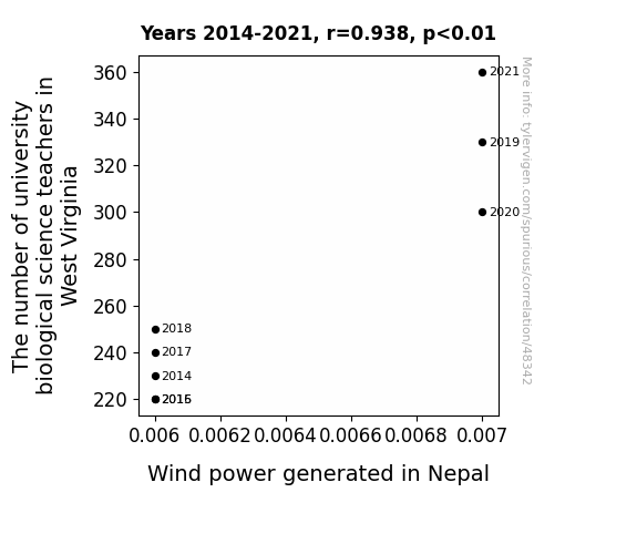 This means 87.9% of the change in the one variable (i.e., Wind power generated in Nepal) is predictable based on the change in the other (i.e., The number of university biological science teachers in West Virginia) over the 8 years from 2014 through 2021.