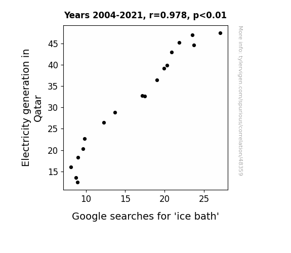 This means 95.6% of the change in the one variable (i.e., Google searches for 'ice bath') is predictable based on the change in the other (i.e., Electricity generation in Qatar) over the 18 years from 2004 through 2021.