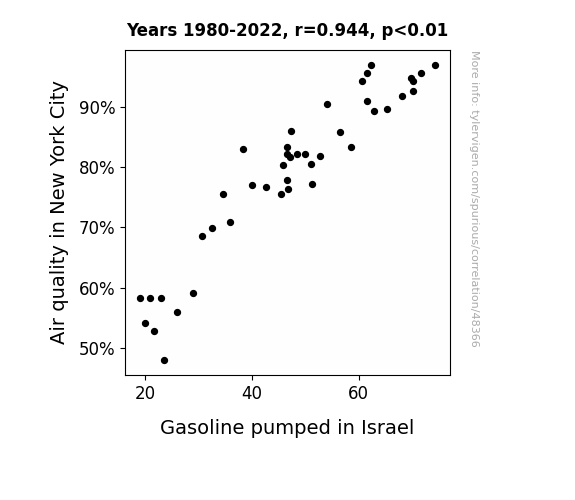 This means 89.1% of the change in the one variable (i.e., Gasoline pumped in Israel) is predictable based on the change in the other (i.e., Air quality in New York City) over the 43 years from 1980 through 2022.