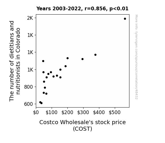 This means 73.2% of the change in the one variable (i.e., Costco Wholesale's stock price (COST)) is predictable based on the change in the other (i.e., The number of dietitians and nutritionists in Colorado) over the 20 years from 2003 through 2022.