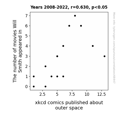This means 39.7% of the change in the one variable (i.e., xkcd comics published about outer space) is predictable based on the change in the other (i.e., The number of movies Will Smith appeared in) over the 15 years from 2008 through 2022.