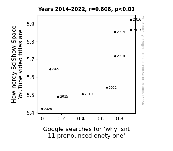 This means 65.2% of the change in the one variable (i.e., Google searches for 'why isnt 11 pronounced onety one') is predictable based on the change in the other (i.e., How nerdy SciShow Space YouTube video titles are) over the 9 years from 2014 through 2022.