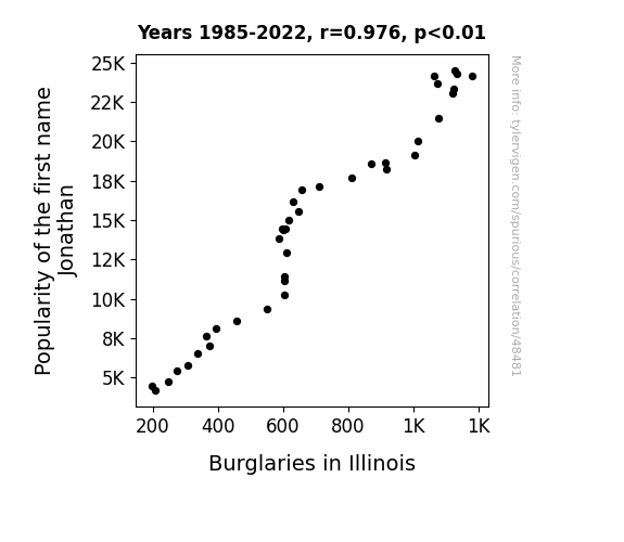 This means 95.2% of the change in the one variable (i.e., Burglaries in Illinois) is predictable based on the change in the other (i.e., Popularity of the first name Jonathan) over the 38 years from 1985 through 2022.