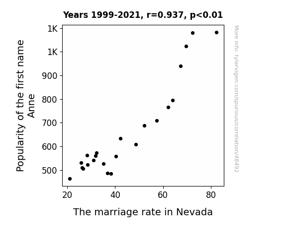 This means 87.9% of the change in the one variable (i.e., The marriage rate in Nevada) is predictable based on the change in the other (i.e., Popularity of the first name Anne) over the 23 years from 1999 through 2021.