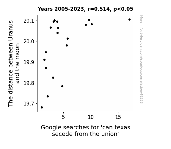 This means 26.4% of the change in the one variable (i.e., Google searches for 'can texas secede from the union') is predictable based on the change in the other (i.e., The distance between Uranus and the moon) over the 19 years from 2005 through 2023.