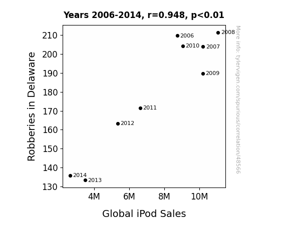 This means 90% of the change in the one variable (i.e., Global iPod Sales) is predictable based on the change in the other (i.e., Robberies in Delaware) over the 9 years from 2006 through 2014.