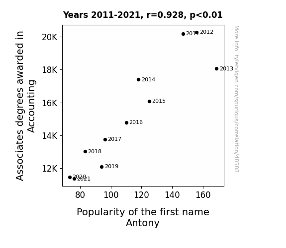 This means 86% of the change in the one variable (i.e., Popularity of the first name Antony) is predictable based on the change in the other (i.e., Associates degrees awarded in Accounting) over the 11 years from 2011 through 2021.