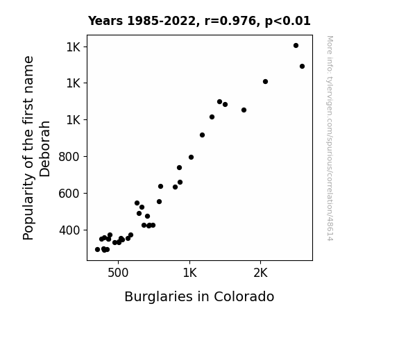 This means 95.3% of the change in the one variable (i.e., Burglaries in Colorado) is predictable based on the change in the other (i.e., Popularity of the first name Deborah) over the 38 years from 1985 through 2022.