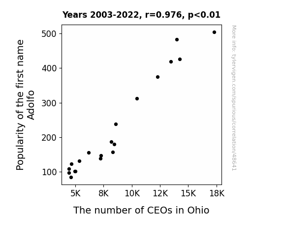 This means 95.2% of the change in the one variable (i.e., The number of CEOs in Ohio) is predictable based on the change in the other (i.e., Popularity of the first name Adolfo) over the 20 years from 2003 through 2022.