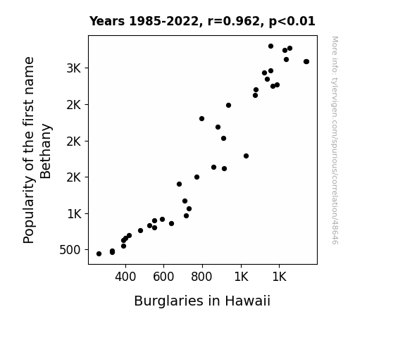 This means 92.6% of the change in the one variable (i.e., Burglaries in Hawaii) is predictable based on the change in the other (i.e., Popularity of the first name Bethany) over the 38 years from 1985 through 2022.