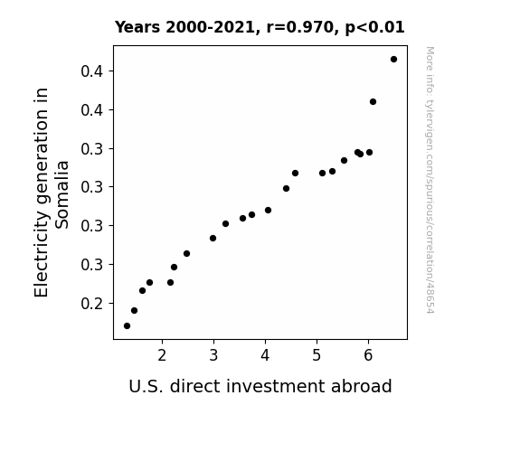 This means 94% of the change in the one variable (i.e., U.S. direct investment abroad) is predictable based on the change in the other (i.e., Electricity generation in Somalia) over the 22 years from 2000 through 2021.