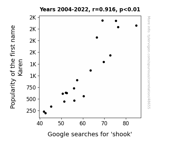 This means 83.8% of the change in the one variable (i.e., Google searches for 'shook') is predictable based on the change in the other (i.e., Popularity of the first name Karen) over the 19 years from 2004 through 2022.