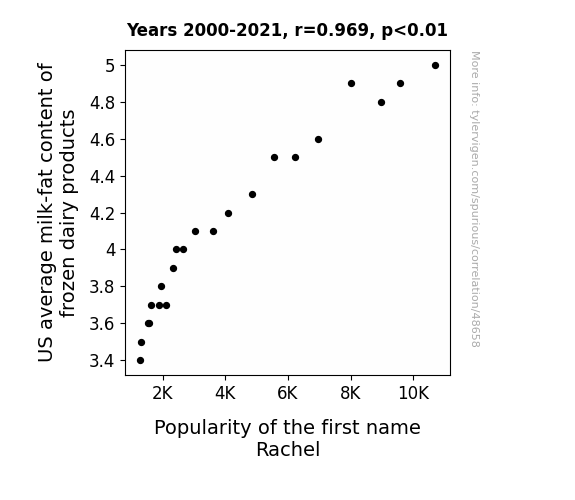 This means 93.9% of the change in the one variable (i.e., Popularity of the first name Rachel) is predictable based on the change in the other (i.e., US average milk-fat content of frozen dairy products) over the 22 years from 2000 through 2021.