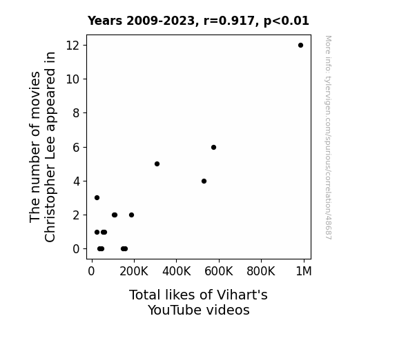 This means 84.1% of the change in the one variable (i.e., Total likes of Vihart's YouTube videos) is predictable based on the change in the other (i.e., The number of movies Christopher Lee appeared in) over the 15 years from 2009 through 2023.