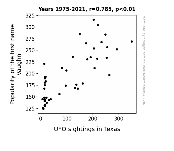 This means 61.6% of the change in the one variable (i.e., UFO sightings in Texas) is predictable based on the change in the other (i.e., Popularity of the first name Vaughn) over the 47 years from 1975 through 2021.