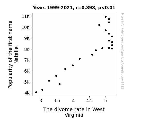 This means 80.7% of the change in the one variable (i.e., The divorce rate in West Virginia) is predictable based on the change in the other (i.e., Popularity of the first name Natalie) over the 23 years from 1999 through 2021.