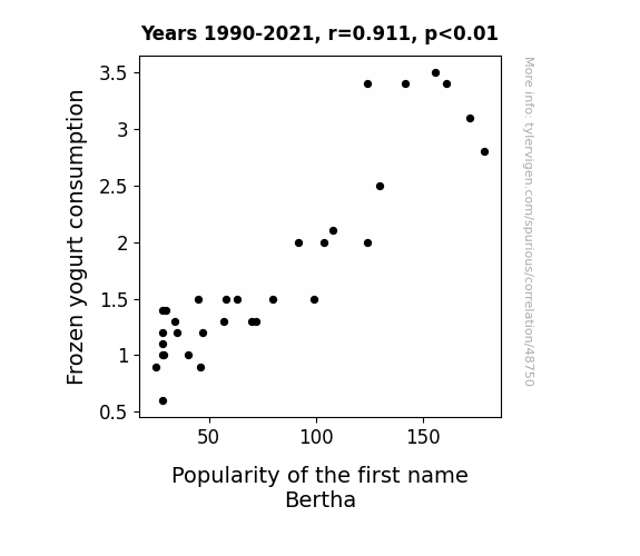 This means 83% of the change in the one variable (i.e., Popularity of the first name Bertha) is predictable based on the change in the other (i.e., Frozen yogurt consumption) over the 32 years from 1990 through 2021.