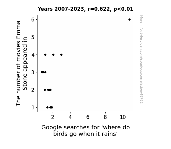 This means 38.7% of the change in the one variable (i.e., Google searches for 'where do birds go when it rains') is predictable based on the change in the other (i.e., The number of movies Emma Stone appeared in) over the 17 years from 2007 through 2023.