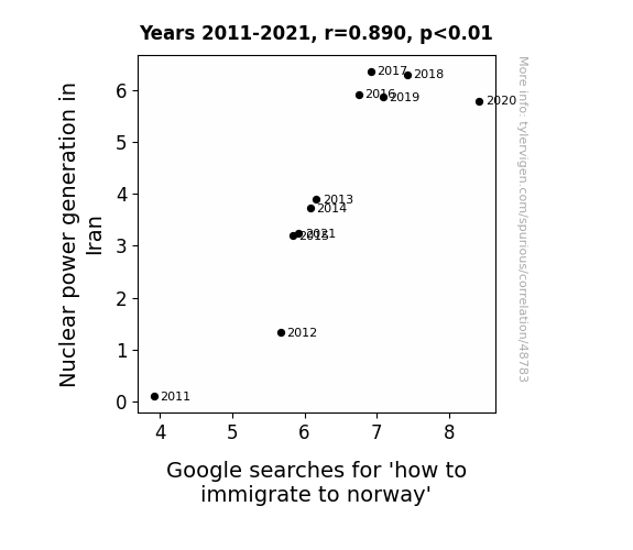 This means 79.2% of the change in the one variable (i.e., Google searches for 'how to immigrate to norway') is predictable based on the change in the other (i.e., Nuclear power generation in Iran) over the 11 years from 2011 through 2021.