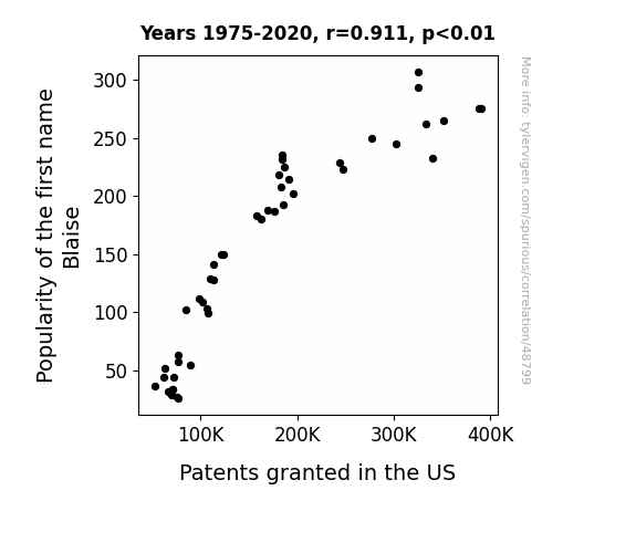 This means 82.9% of the change in the one variable (i.e., Patents granted in the US) is predictable based on the change in the other (i.e., Popularity of the first name Blaise) over the 46 years from 1975 through 2020.