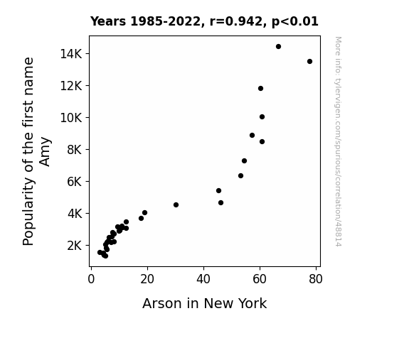 This means 88.7% of the change in the one variable (i.e., Arson in New York) is predictable based on the change in the other (i.e., Popularity of the first name Amy) over the 38 years from 1985 through 2022.