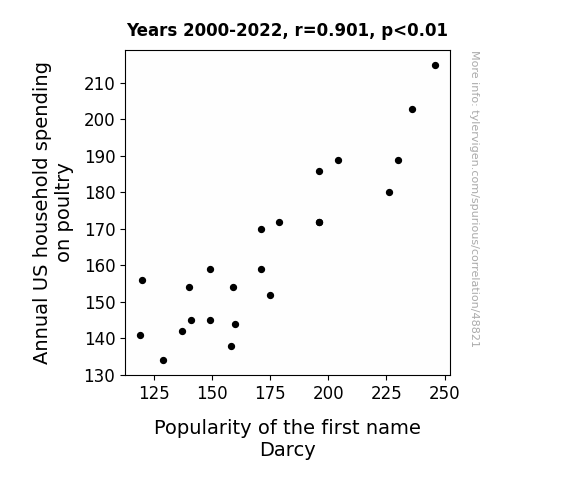 This means 81.2% of the change in the one variable (i.e., Popularity of the first name Darcy) is predictable based on the change in the other (i.e., Annual US household spending on poultry) over the 23 years from 2000 through 2022.