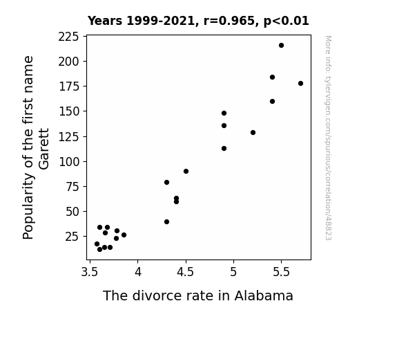 This means 93% of the change in the one variable (i.e., The divorce rate in Alabama) is predictable based on the change in the other (i.e., Popularity of the first name Garett) over the 23 years from 1999 through 2021.