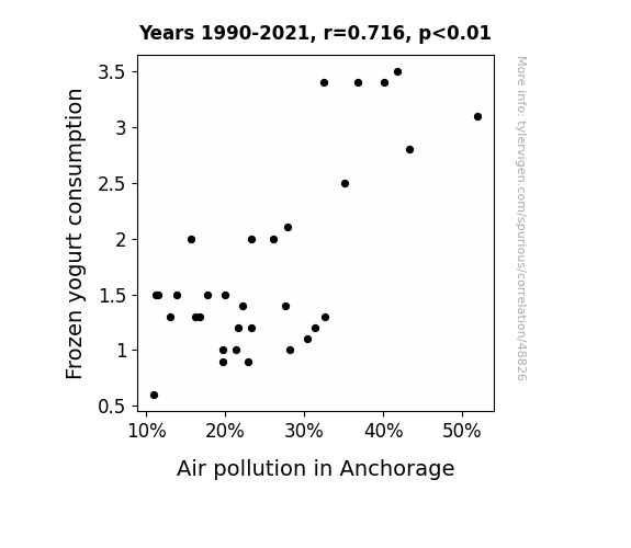 This means 51.3% of the change in the one variable (i.e., Air pollution in Anchorage) is predictable based on the change in the other (i.e., Frozen yogurt consumption) over the 32 years from 1990 through 2021.