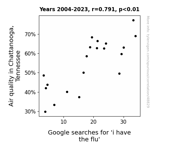 This means 62.5% of the change in the one variable (i.e., Google searches for 'i have the flu') is predictable based on the change in the other (i.e., Air quality in Chattanooga, Tennessee) over the 20 years from 2004 through 2023.
