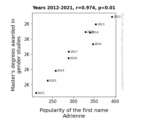 This means 94.9% of the change in the one variable (i.e., Popularity of the first name Adrienne) is predictable based on the change in the other (i.e., Master's degrees awarded in gender studies) over the 10 years from 2012 through 2021.