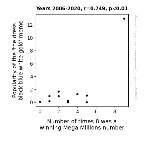 This means 56.1% of the change in the one variable (i.e., Number of times 8 was a winning Mega Millions number) is predictable based on the change in the other (i.e., Popularity of the 'the dress black blue white gold' meme) over the 15 years from 2006 through 2020.