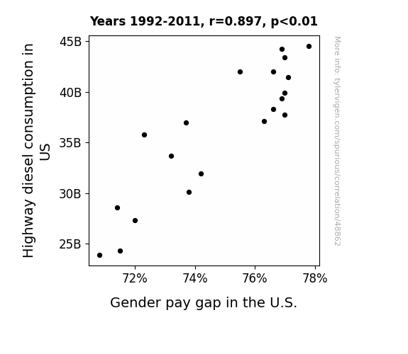 This means 80.4% of the change in the one variable (i.e., Gender pay gap in the U.S.) is predictable based on the change in the other (i.e., Highway diesel consumption in US) over the 20 years from 1992 through 2011.