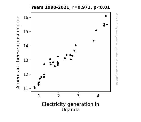 This means 94.3% of the change in the one variable (i.e., Electricity generation in Uganda) is predictable based on the change in the other (i.e., American cheese consumption) over the 32 years from 1990 through 2021.
