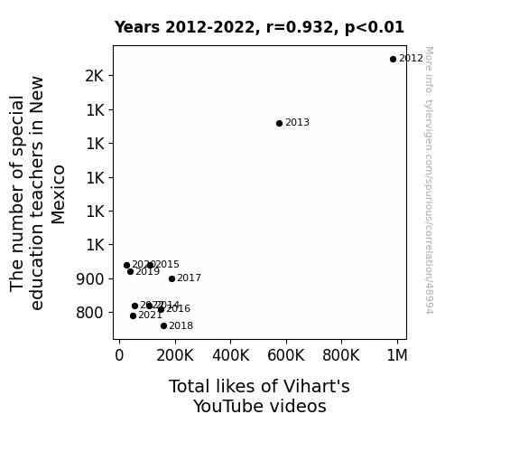 This means 86.9% of the change in the one variable (i.e., Total likes of Vihart's YouTube videos) is predictable based on the change in the other (i.e., The number of special education teachers in New Mexico) over the 11 years from 2012 through 2022.