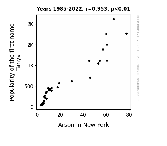 This means 90.7% of the change in the one variable (i.e., Arson in New York) is predictable based on the change in the other (i.e., Popularity of the first name Tanya) over the 38 years from 1985 through 2022.