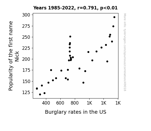 This means 62.6% of the change in the one variable (i.e., Burglary rates in the US) is predictable based on the change in the other (i.e., Popularity of the first name Nick) over the 38 years from 1985 through 2022.