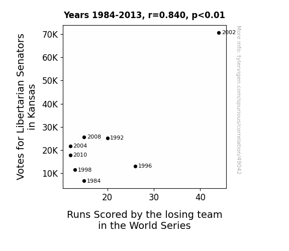 This means 70.6% of the change in the one variable (i.e., Runs Scored by the losing team in the World Series) is predictable based on the change in the other (i.e., Votes for Libertarian Senators in Kansas) over the 8 years from 1984 through 2013.