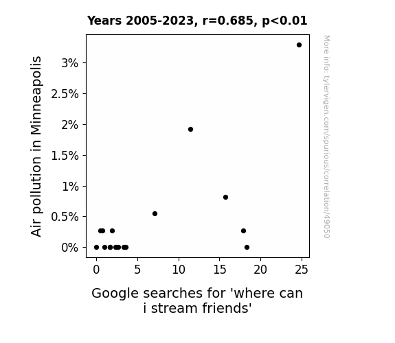 This means 47% of the change in the one variable (i.e., Google searches for 'where can i stream friends') is predictable based on the change in the other (i.e., Air pollution in Minneapolis) over the 19 years from 2005 through 2023.