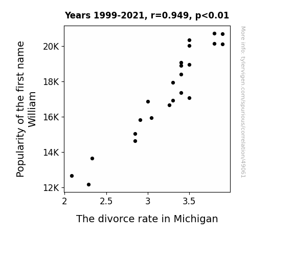 This means 90.1% of the change in the one variable (i.e., The divorce rate in Michigan) is predictable based on the change in the other (i.e., Popularity of the first name William) over the 23 years from 1999 through 2021.
