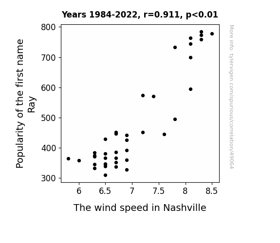 This means 83% of the change in the one variable (i.e., The wind speed in Nashville) is predictable based on the change in the other (i.e., Popularity of the first name Ray) over the 39 years from 1984 through 2022.