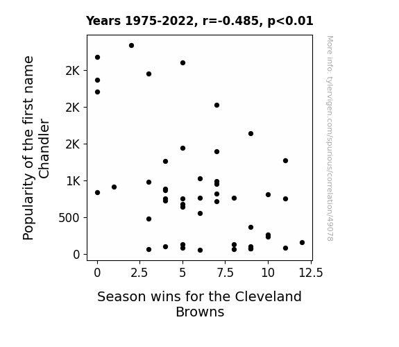 This means 23.5% of the change in the one variable (i.e., Season wins for the Cleveland Browns) is predictable based on the change in the other (i.e., Popularity of the first name Chandler) over the 48 years from 1975 through 2022.