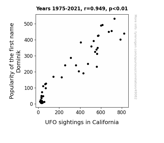 This means 90.1% of the change in the one variable (i.e., UFO sightings in California) is predictable based on the change in the other (i.e., Popularity of the first name Dominik) over the 47 years from 1975 through 2021.