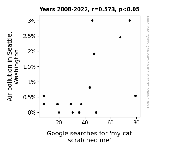 This means 32.9% of the change in the one variable (i.e., Google searches for 'my cat scratched me') is predictable based on the change in the other (i.e., Air pollution in Seattle, Washington) over the 15 years from 2008 through 2022.