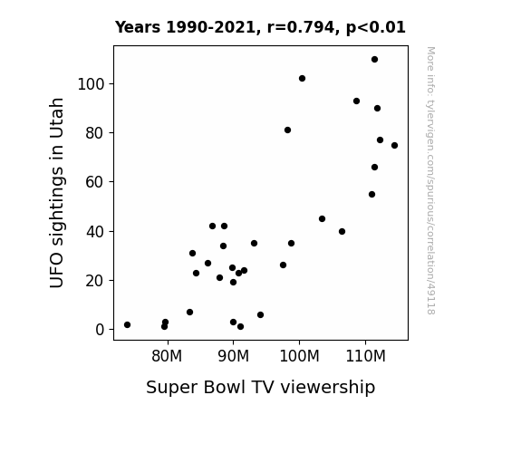 This means 63% of the change in the one variable (i.e., Super Bowl TV viewership) is predictable based on the change in the other (i.e., UFO sightings in Utah) over the 32 years from 1990 through 2021.