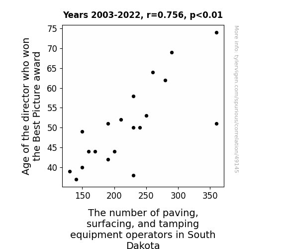 This means 57.2% of the change in the one variable (i.e., The number of paving, surfacing, and tamping equipment operators in South Dakota) is predictable based on the change in the other (i.e., Age of the director who won the Best Picture award) over the 20 years from 2003 through 2022.
