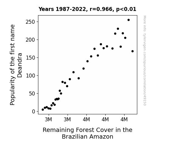 This means 93.3% of the change in the one variable (i.e., Remaining Forest Cover in the Brazilian Amazon) is predictable based on the change in the other (i.e., Popularity of the first name Deandra) over the 36 years from 1987 through 2022.