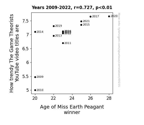 This means 52.9% of the change in the one variable (i.e., Age of Miss Earth Peagant winner) is predictable based on the change in the other (i.e., How trendy The Game Theorists YouTube video titles are) over the 14 years from 2009 through 2022.
