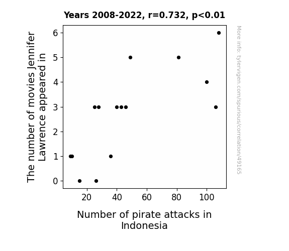 This means 53.6% of the change in the one variable (i.e., Number of pirate attacks in Indonesia) is predictable based on the change in the other (i.e., The number of movies Jennifer Lawrence appeared in) over the 15 years from 2008 through 2022.